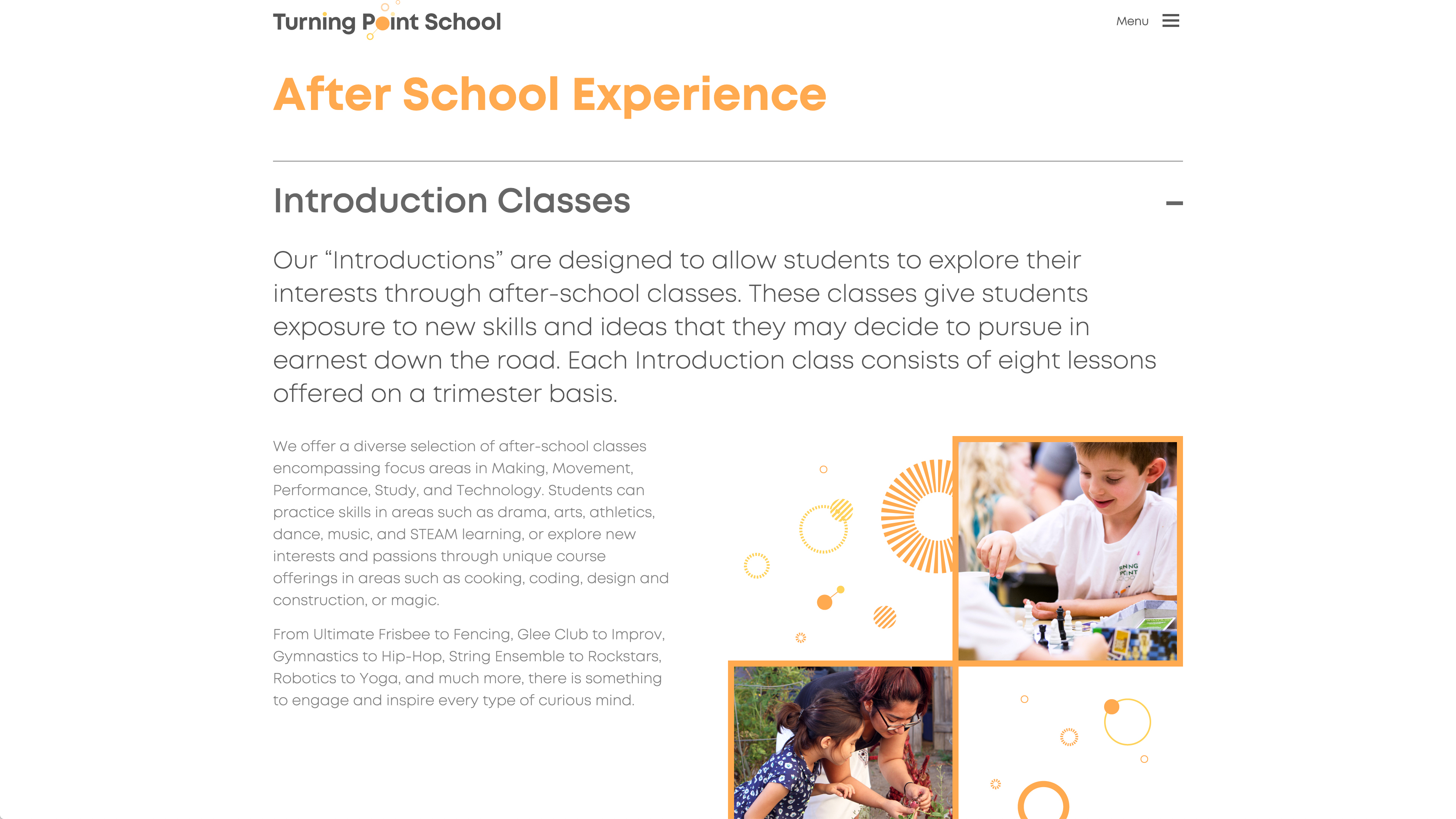 The elements and education at Turning Point School are flexible and modular in order to adapt to different students and changing times, but everything they do is still based in rigorous scientific research. To reflect that, the branding as a whole, including the website itself, is designed to be flexible and modular in its layout while still being based on a rigorous grid system.